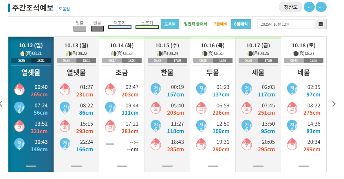 - 날짜·지역 선택 → 간조/만조 시간 확인